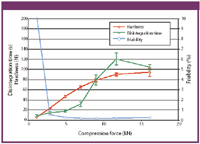 Figure 2: Hardness, friability, and disintegration as a function of compressed force using loperamide tablets with 0% Kollidon CLSF. Kollidon CL-SF is a registered trademark of BASF SE. (ALL FIGURES ARE COURTESY OF BASF SE.)