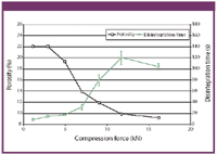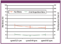 The hardness of loperamide HCl tablets was slightly reduced by increasing the tableting speed from 20 to 60 rpm, but disintegration time remained constant (see Figure 4).