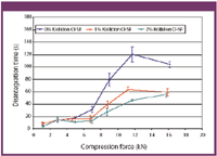 As expected, the disintegration times can be further shortened by the addition of Kollidon CL-SF (1% and 2%), which is accompanied by a tendency toward higher hardness and lower friability. With these formulations, tableting pressures can be increased to 140 MPa without a negative impact on disintegration (see Figure 5).