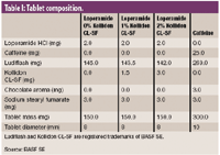 Materials. The following materials were used in the study: a fast dispersible excipient (Ludiflash, BASF SE) based on mannitol, polyvinyl acetate, and crospovidone; loperamide HCl (Selectchemie, Zurich, Switzerland); caffeine fine powder (BASF SE); sodium stearyl fumarate (Pruv, J. Rettenmaier & Söhne GmbH + Co. KG, Rosenberg, Germany); and crospovidone (Kollidon CL-SF, BASF SE).