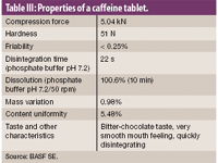 Caffeine tablets gave similar results: 5.48% content uniformity, 0.98% mass variation, 100.6% dissolution after 10 min (see Table III).