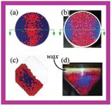 Figure 2: (a) Top view of the segregation of 12-mm (red) and 6-mm (blue) spheres in a double-cone tumbler after 12 revolutions at 30 rpm. (b) Top view for comparison, using 4-mm (red) and 1.6-mm (blue) glass spheres. (c) Slice through the vertical plane passing through the blenderôs axis of rotation, showing interior structure in the simulation. (d) Slice through the corresponding vertical plane in the experiment.