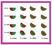 The effect of cohesion on the mixing and segregation of the uniform binary mixture also can be captured by simulations. The computational model system for this case study consisted of 10,000 green and 10,000 red identical particles of 2-mm diameter, loaded initially side-by-side along the axis. The mixing drum in the simulation had a 9-cm diameter and a 1-cm length; It was rotated at 20 rpm. Four cohesion values were simulated with our model system. Snapshots for each value of K were compared (see Figure 5). Snapshots were taken at t = 0, 1, 3, and 5 revolutions.