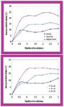 Figure 4: Effect of cohesion on dilation. Experiment (top) performed using powdered lactose, Avicel-102, and Fast-Flo Lactose. Simulation (bottom) corresponds to K = 45, 60, and 90.