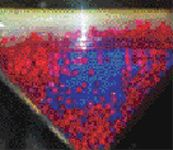 Figure 2(a) shows the prediction of segregation patterns and displays a top view of a simulation using a bidisperse mixture of approximately equal masses of large and small beads. First, 11,500 small (6-mm diameter, blue) spheres were mixed randomly with 1500 large (12-mm diameter, red) spheres. The blend was rotated at 30 rpm for 12 revolutions. For comparison, a snapshot was taken of an experiment in which an equal mass blend of 1.6-mm (blue) and 4-mm (red) diameter glass beads were rotated at 16 rpm in a 1-qt double-cone blender (see Figure 2[b]). In both the experiment and the simulation, the tumbler was filled initially to 50% of its total volume.