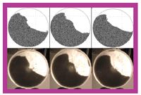 Figure 3: Typical avalanching behavior, captured in a time sequence, displayed by the DEM model (20 rpm) for K = 60. The bottom row shows experimental snapshots (7 rpm) for A102 showing essentially identical behavior for comparison.