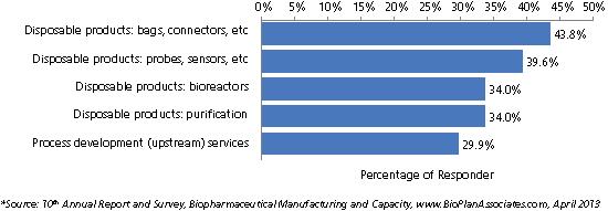 Results from BioPlan’s study show that disposable innovation is growing. Interest in new disposable products is up in this year’s survey, and bags and connectors represent the highest level in at least the past four years at 43.8% of respondents (up from 38.9% in 2010). The same is true for disposable probes and sensors, up from 29.3% of respondents in 2010 to 39.6% in 2013.