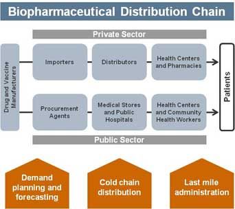 Pharmaceutical distribution in emerging and developing markets is no easy task. Biopharmaceutical distribution chains in emerging markets are notoriously complex, often involving private-sector partners (e.g., importers, distributors, and pharmacies) as well as public-sector organizations (e.g., procurement agents, public hospitals, and health centers). Figure 1 provides a simplified illustration of the links connecting manufacturers to patients.