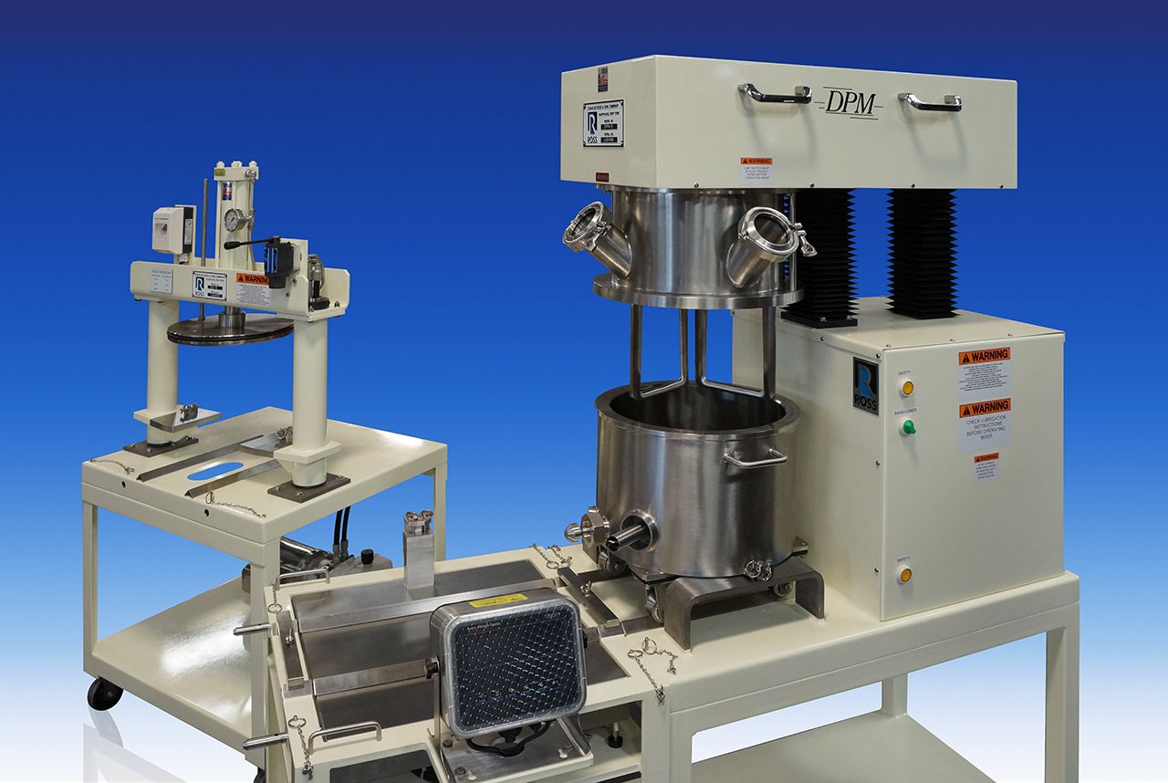The ROSS Double Planetary Mixer from Charles Ross & Son Company is available with an optional weighing system for precise measurements throughout the batching procedure. The turnkey system (pictured) comes equipped with a mixer, weighing scale, and discharge system on mobile benches, with the ability to attach to one another, and to transfer carts of the same height. V-groove tracks allow easy movement of the Double Planetary Mixer vessel to the weighing station, and on to the discharge press for direct filling of syringes, tubes, or other containers.