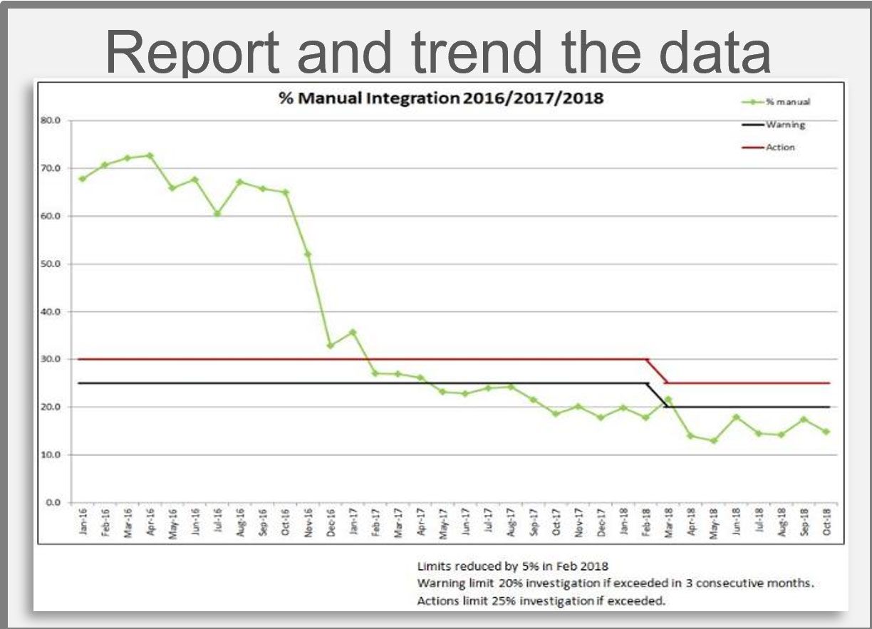 Figure 2: Modern CDS solutions effectively trend captured data to support proactive issue resolution. Here, a high incidence of manual integrations was observed and then rapidly corrected. (Figure courtesy of the author)