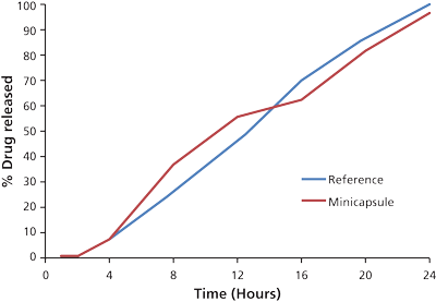 For coextruded minicapsules, their spherical shape and narrow particle size distribution (within 3% by weight) can facilitate uniform application of polymeric coatings (see Figure 2). In this case, a methacrylate sustained-release coating was applied to a minicapsule containing a BCS Class II drug. High coating efficiency on multiparticulates can result in sustained-release action comparable to specifically designed sustained-release devices such as osmotic pump systems (see Figure 3).
