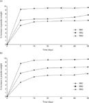 The profiles in Figure 6 indicate that the increase in moisture uptake of tablet was linear in the initial stage due to the moisture absorption by the outer layers of tablets, followed by slower phase in the deeper layers. A plateau region followed this initial phase after the surfaces of the tablets became saturated with water vapour and no more water vapour could further penetrate the surface. The rank order of moisture sorption for the tablets of each formula was: uncoated tablets > tablets coated with HPMC > tablets coated with Eudragit E-100. Thus, Eudragit E-100 coat provided better protection against moisture sorption.