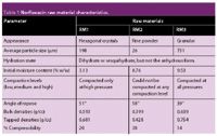 Angles of repose were 51 °, 58 ° and 39 ° for RM1, RM 2 and RM3 respectively (Table 1). The coarse norfloxacin RM1 exhibited better flow than the finer raw material RM2. Granular RM3 showed the best flow. As a general guide, powders with angles of repose greater than 50 ° have unsatisfactory flow, whereas angles close to 25 ° correspond to good flow properties.8