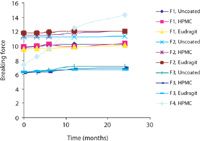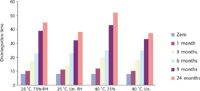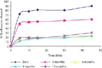Although freshly prepared F4 tablets passed the USP 25 dissolution test, they failed to pass the test after storage, for example, after 12 months at 25 °C and 40 °C (Figure 7). Statistically significant differences (P=0.001; ANOVA) in dissolution results were evident for freshly prepared F4 tablets, compared with those stored for 3, 6, 9 and 12 months at the same storage temperature.