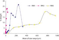 SEMs of RM1 and RM2 indicated that the latter material consisted of fine crystalline material; whereas large hexagonal crystals were observed in RM1 mounts (Figure 1). Table 1 and Figure 2 show results for particle size analysis of the raw materials. The average particle size was found to be 198, 26 and 730 μm for RM1, RM2 and RM3, respectively. This variation had direct effects on the flow and compression properties of the materials. Particle size distribution, as well as bulk density changes would influence die filling and hence compression properties of dry raw materials as shown previously for ibuprofen.3
