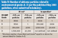 Table IV: Number of airborne particles related in environmental grades AâD (per the published May 2003 guidelines, when submitted to industry).