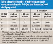 Table I: Proposed number of airborne particles in environmental grades AâD (per the November 2005 draft proposals).