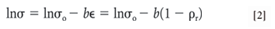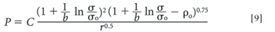 in which є, b, and lnσ0 in Equation 2 are porosity and constants obtained from the slope and intercept of the plot ln σversus (1 – ρr), respectively. Hmax and ρ0 in Equation 3 are, respectively, the maximum hardness at zero porosity and the initial relative density needed for minimal shear strength of the powder bulk. When one substitutes Equation 1 into Equation 2 and Equation 3, tensile strength and hardness become functions of macroscopic compaction pressure P.