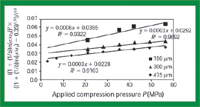 Apparently, linearity in Figures 1, 3, and 4 seems to verify the validity of Equations 7, 9, and 10 and suggests that the initial particle-size effects of r0.5 on densification, tensile strength, and hardness, which are different from the average number of interparticle contacts and the contact force, for they scale with r2 , the square of particle size (2, 11). There are two caveats, however. First, the particle size r that we used is the average of each particle size fraction by sieving. For example, r =105 μm in Figure 1 actually is the average of the particle fraction of 105–210 μm in the published article (6). Second, strictly speaking, hardness is the resistance of a material to penetration. By assuming pure α-lactose monohydrate powders are ductile, however, we were able to test their parallel crushing strength using Equation 10. The nonlinearity in Figure 2 mainly results from the measurement fluctuations of the original compaction data (Figure 9) of Sprockel et al. (10).