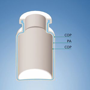 Multilayer plastic containers, such as the Gx MultiShell vial from Gerresheimer, offer higher barrier properties for parenteral drugs with alkaline pH ranges as well as potent pharmaceuticals. Uniting the best properties of plastic and glass, the cyclic olefin polymer (COP)/polyamide/COP structure shown in Figure 1 does not interact with alkaline liquids, leaches virtually no organic substances, and is more break-resistant than the equivalent glass container. Gerresheimer also offers ClearJect COP syringes. The heavy metal-free COP is particularly well-suited for sensitive oncology and ophthalmology medications.