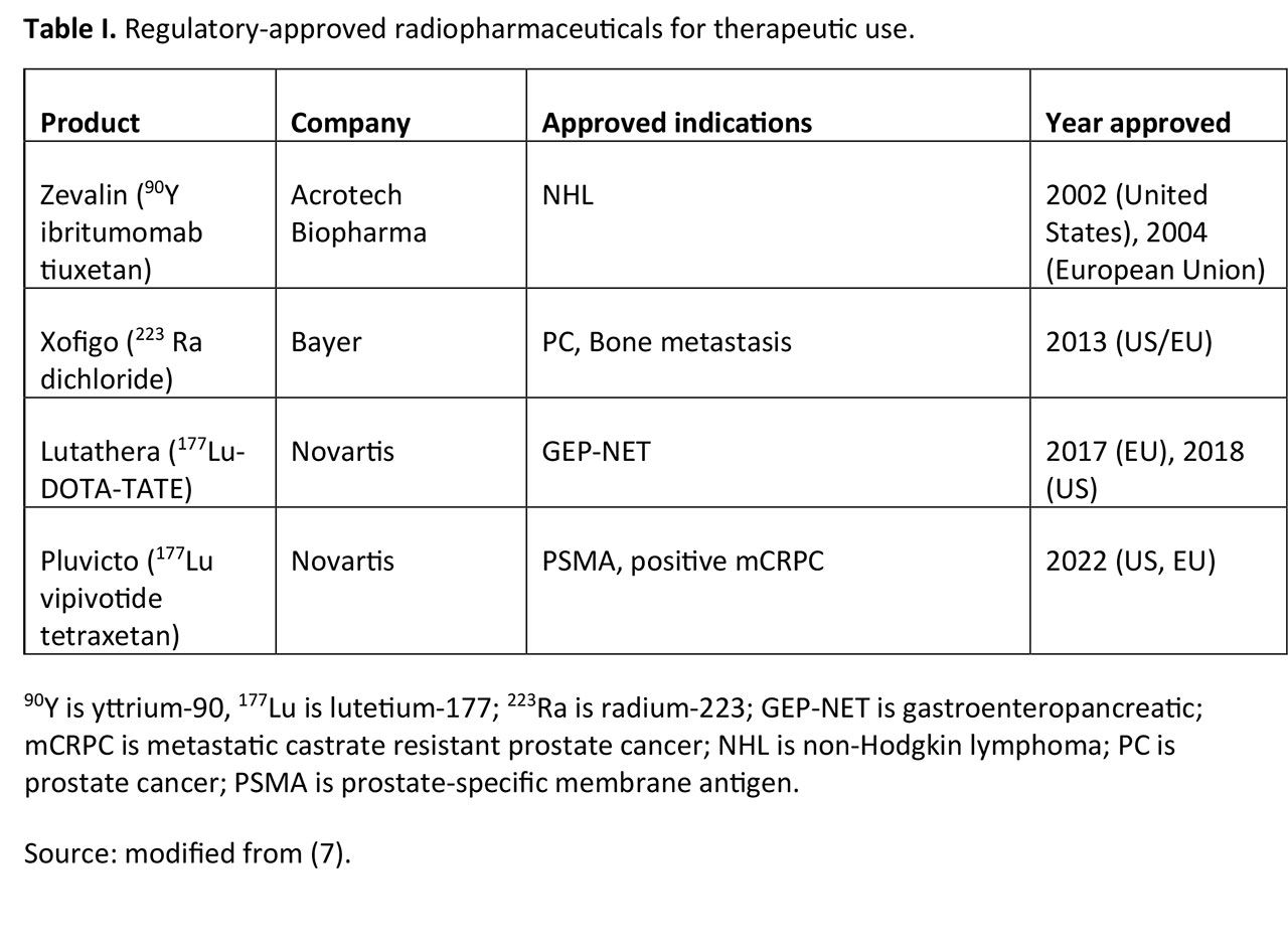 Table I. Regulatory-approved radiopharmaceuticals for therapeutic use. Modified from KPMG. Leveraging Opportunities in Radiopharmaceuticals. Kpmg.com. 21 Mar. 2025.
