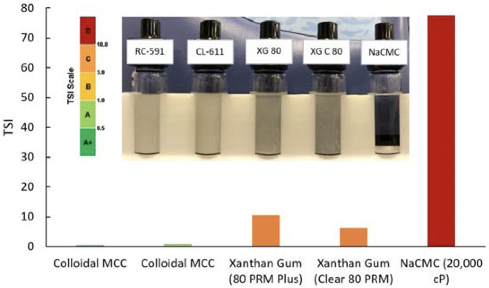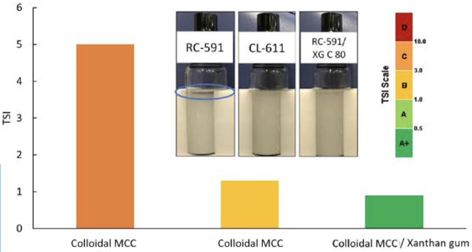 FIGURE 3. TSI for colloidal MCC and combination of colloidal MCC with xanthan gum under low pH conditions.