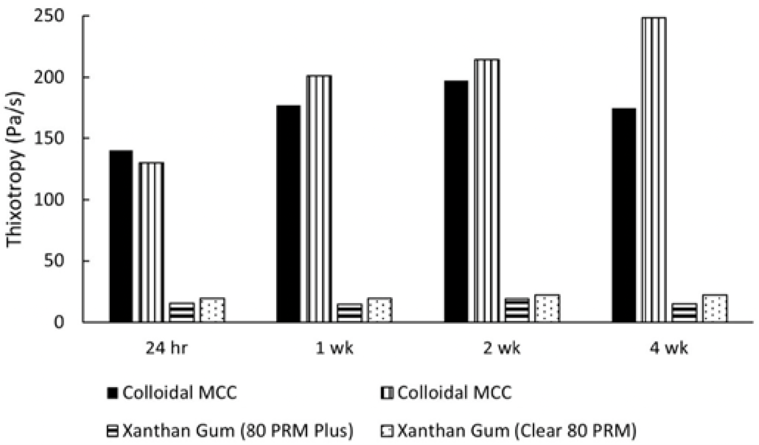 FIGURE 1. Thixotropy of suspension formulations upon storage. NaCMC did not exhibit thixotropic behavior.