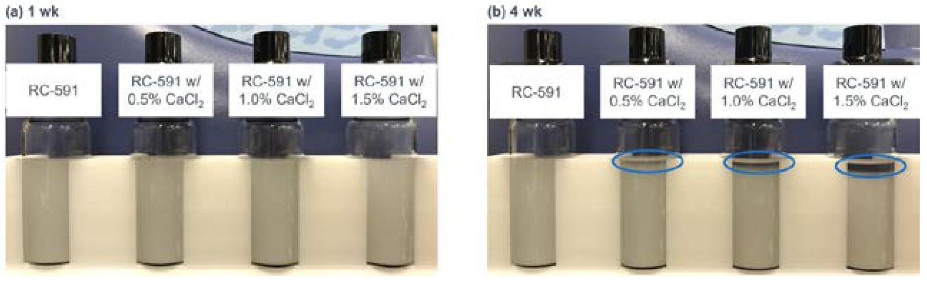 FIGURE 4. Colloidal MCC (pre-made liquid) formulated suspension images with increasing salt content at one week (a) and four weeks (b).