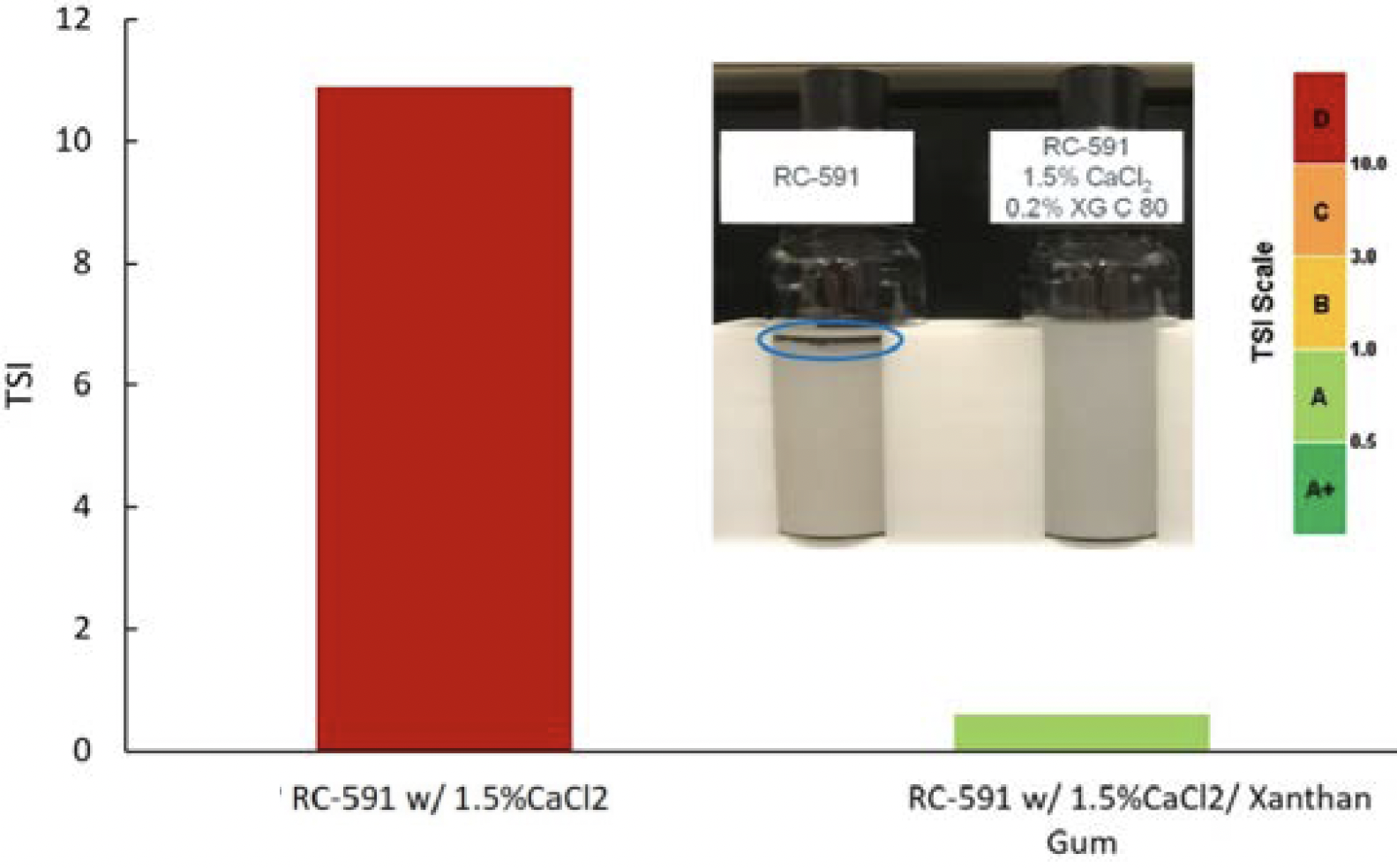 FIGURE 5. TSI for colloidal MCC (premade liquid) with high salt content and the impact of adding a protective colloid. Images of suspensions (insert).