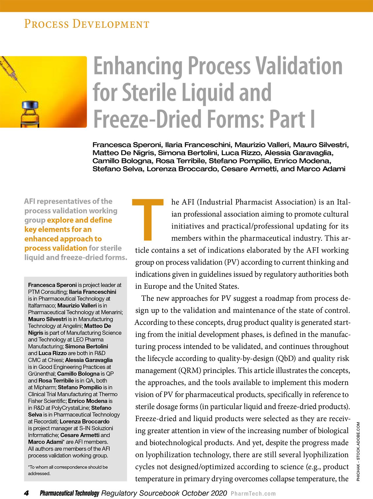 When referring to this article, please cite it as F. Speroni, et al., "Enhancing Process Validation for Sterile Liquid and Freeze-Dried Forms: Part 1," Pharmaceutical Technology Regulatory Sourcebook eBook (October 2020).