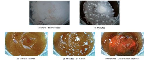 Novel methods for both qualitative and quantitative measurement of powder–liquid mixing, including powder dispersion and dissolution, were employed at MilliporeSigma. Use of acrylic prototype vessels during development provided a powerful tool for characterization of the mixing process because the clear walls allowed qualitative understanding of mixing, not only from the top of the tank, but throughout the entire volume. Measurement devices included real-time monitoring of traditional parameters, such as pH and conductivity. Probe ports were located at minimum working volume, along with probe placement at the top of the vessel, to provide a comprehensive documentation of the mixing process. Beyond traditional measurements, the ParticleTrack tracked changing particle size and count in real time. This instrument was key in not only tracking powder distribution, but also dissolution.