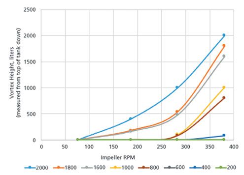 Vortex mapping. The first step in engineering the Mobius Power MIX systems (MilliporeSigma) was construction of acrylic tanks, with dimensions and equipment (e.g., impellers and motors) as models for the final design. These acrylic tanks provided the first qualitative evidence of the mixing potential for powder–liquid mixing. The generation of a strong vortex is vital to keeping sinking powders off the bottom of the vessel and allow the transport of floating powders off the liquid surface and into the bulk solution. Vortex height was measured at a range of speeds (i.e., impeller RPM) from 20% to 100% of maximum speed and at working volumes from 20% to 100% of the full volume in the 2000-L vessel, as plotted in the vortex map in Figure 1A. The vortex map allows an understanding of critical speeds and volumes to optimize powder–liquid mixing. Figure 1B shows the vortex in the clear tank at a range of speeds with an 1800-L working volume.