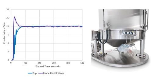 Monitoring conductivity. Traditional methods for quantifying a mixing process include measurement of a traceable parameter over time and identification of the time to a stable measurement. For most buffers and media, measurement of conductivity can be used to trace the concentration of powder in solution. To enhance this method, real-time monitoring provides an advantage over sampling, as does monitoring in multiple locations. The mixing of 1X Dulbecco’s Phosphate-Buffered Saline (DPBS) in the Mobius Power MIX 2000 was determined by measuring conductivity in two key locations, at the top of the liquid volume and at the low volume of 300 L, where ports for sampling and probes are located. The advantage of monitoring at a one-second sample rate was evident in analyzing the traces during the first two minutes of mixing, as shown in Figure 2. The action of the sinking powder was clearly seen as an immediate spike in conductivity near the bottom of the vessel. As mixing progressed, the conductivity measurements at the minimum and maximum volumes converged to show a final homogeneous solution.