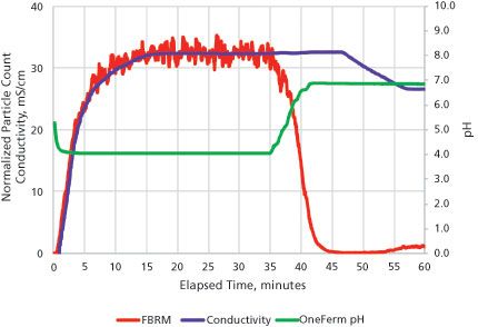 Floating media powder. In another case study, mixing of a floating media powder was examined. A quantitative record of media mixing was created by collecting conductivity, particle count, and pH measurements obtained during mixing of a chemically-defined Chinese hamster ovary (CHO) medium (see Figure 4). In this case, conductivity reached a stable value at 15 min, when most of the floating powder was incorporated into solution. Once again, conductivity alone does not give the best record of mixing. At 25 min, with no visible powder on the surface, particle count peaked at a maximum value, indicating complete powder distribution into the bulk liquid. Dissolution of components in the chemically defined medium did not happen until the pH of the solution was adjusted up to pH 7. Here, the FBRM provided a striking record of particle count decreasing to zero with the increase in pH. The FBRM probe is sensitive enough to recognize air bubbles created during volume increase to 2000 L at 55 min, suggesting that FBRM can be used as an indicator for unwanted foaming. The use of multiple sensors is necessary to fully document the mixing process and quantify the mixing time beyond just visually mixed.