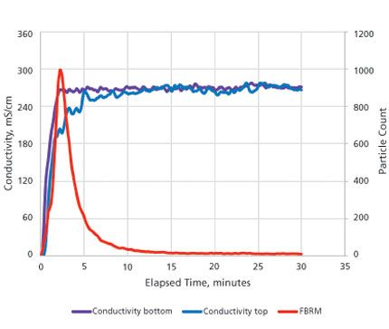 Sinking powders. Conductivity measurements alone do not always give the most complete picture of solid-liquid mixing, because this process involves both the distribution and dissolution of particles. Reaching a stable conductivity measurement will indicate complete distribution of the powder, but not complete dissolution. Visual records can be made to describe dissolution, but it is useful to have a quantitative measurement of powder dissolution. Measurement of particles, both size and count, can be accomplished through the use of the ParticleTrack FBRM technology.