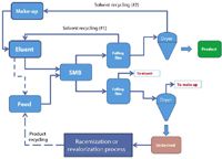 Figure 2: Simulated moving-bed (SMB) chromatographic process for a chiral separation with eluent recycling and unwanted enantiomer revalorization. (FIGURE IS COURTESY OF THE AUTHOR)