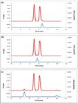 Figure 4: Separation of impurity(ies) during a chiral resolution by chromatography shown with simulated chromatograms. The red graphs represents an overall chromatogram, and the blue graph denotes the impurity(ies). Figure 4(a) is an impurity eluting with one of the enantiomers. Figure 4(b) is an impurity eluting between the two enantiomers. Figure 4(c) shows impurities eluting much earlier or later than the enantiomer. (FIGURE IS COURTESY OF THE AUTHOR)