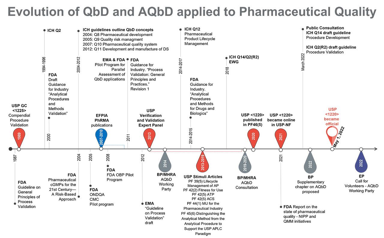 Despite the existing ICH guidelines Q8–Q12 outlining QbD principles applied to drug development, AP are not considered in their scope, although all the concepts apply to APLC. The early development of compendial approaches and capability building activities by USP has been helping to pave the way for the transformation of the quality culture based on new quality paradigms. USP, together with other worldwide organizations/associations, has been promoting the AQbD principles that may transform the quality culture by enabling and supporting innovation for both small molecule and biological medicines (7,27–29). The British Pharmacopoeia (BP) has also been playing an important role in this transformation. In 2014, an AQbD working party was established and a new supplementary chapter “Application of AQbD to Pharmacopoeial Methods” was published in BP 2022 (30). In 2019, a consultation was also published by BP and the United Kingdom’s Medicines and Healthcare Products Regulatory Agency (MHRA) to explore the inclusion of AQbD elements in compendial monographs and the consultation response became public available in 2020 (31). A case study was also published in 2019 with focus on the practical application of AQbD principles to the development of an assay procedure for atorvastatin in atorvastatin tablets (32). The atorvastatin tablets monograph was published in BP 2023 including two AQbD elements (ATP and MODR) as non-compendial tools. USP is also working on creating practical case studies to explore how AQbD elements may be included in monographs in the future, with the aim to provide the industry with additional knowledge for proper procedure performance verification and QRM, allowing for continuous quality improvement. USP and BP chapters are informational chapters and aim to provide guidance for the implementation of enhanced approaches to support APLC management. The European Pharmacopeia launched in 2022 a call for volunteers for a new working party on AQbD (33). The APLC concept also underlies the standard ISO/IEC 17025 (34). Figure 3 shows the evolution of QbD considering relevant guidelines.