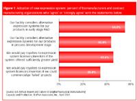 Figure 1: Adoption of new expression system: percent of biomanufacturers and contract manufacturing organizations who 'agree' or 'strongly agree' with the statements below.