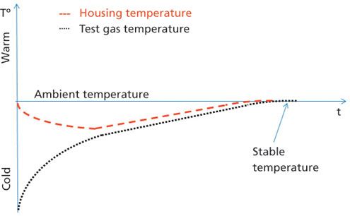 One of the prerequisite conditions for integrity testing is stable temperature. If the device is pressurized with cold compressed gas, the heat exchange between the test gas and the filter housing will cool the housing and heat the gas. As the housing is at a lower temperature than ambient due to the cooling effect of the test gas, the environment will heat the housing and slowly bring both the housing and the test gas to ambient temperature (see Figure 3).