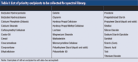 DPA has identified 166 excipients that fit in one or more of the following categories: most commonly used, most vulnerable to adulteration, or needing an update of the US Pharmacopeia monograph. From this list, FDA has narrowed down a priority list of excipients (see Table I). Once library entries for these priority materials have been obtained, the library will be deployed to field inspectors along with any other excipients that have been received. The library will continue to be expanded as additional excipients are received.