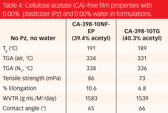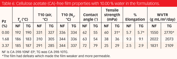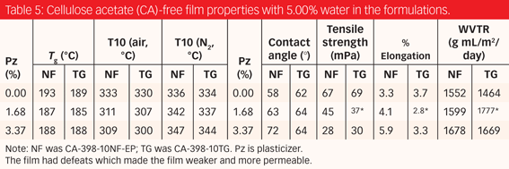 Effects of plasticizer and water level on CA free film propertiesThe CA free films were opaque, except for the two films that did not include water in the formulation, which were transparent. Previous studies concluded that water in the film formulation affects the morphology of the film.13,16 Film properties results are organized in Tables 46 according to the water content in the formulations.