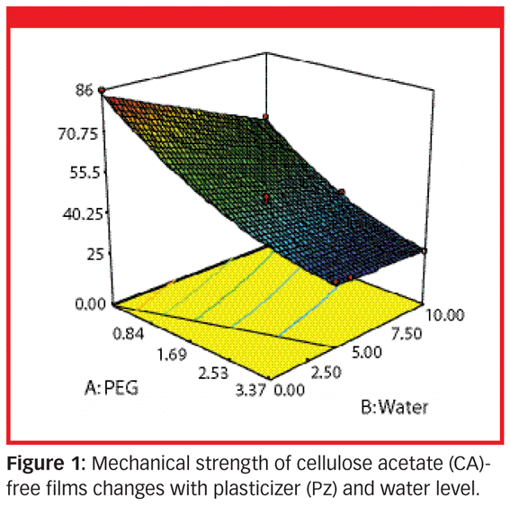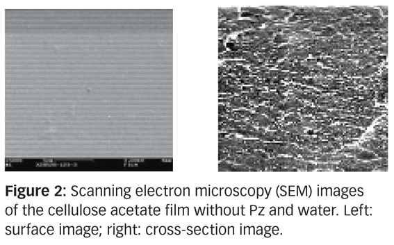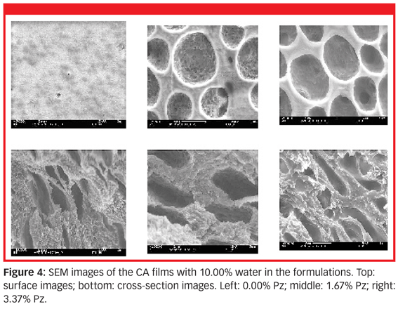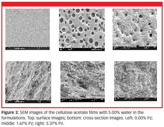 Knowing the relationship between a formulation and its film properties is crucial for designing a membrane to control release rate. When investigating the effects of solvent systems (acetone and acetone/water), polyethylene glycol (PEG) molecular weight and level on the properties of CA‑free films, Yuang, Shang and Wu found that water as a co-solvent in the formulation definitely affected morphology and, ultimately, the properties of the films.12 The films prepared from acetone were transparent, flexible and stronger, but less permeable to water vapor compared with films containing water as a co-solvent. Similar results were published by Meier et al. when they studied the influence of the plasticizer content and film preparation procedure on the morphology, thermal and mechanical properties of CA films plasticized with poly(caprolactone triol) (PCL-T);13 they demonstrated that the addition of water, a non-solvent, during the membrane-casting process was a simple and effective way to change membrane porosity and, consequently, the drug‑permeation profile. When small quantities of non-solvent were used to obtain low-porosity membranes, the presence of a plasticizer agent could be used to better modulate drug permeation.14