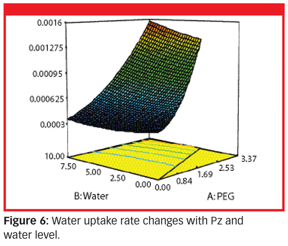The fitted model indicates that an increase in the Pz level in the formulation increases water uptake rate, which is also true for water level. PEG is the major influencing factor (Figure 6).
