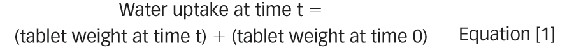 Eight tablets from each coating run were randomly selected and tested in deionized water at 37 °C to determine water uptake using a standard disintegration tester. At selected time intervals, the tested tablets were taken out, gently dried with a tissue and weighed. The water uptake was calculated using the following equation: