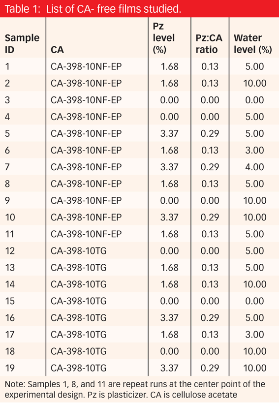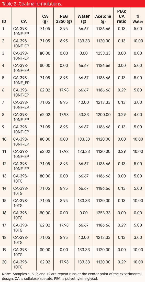 in which PEG is the Pz concentration in the formulation as a percentage (0.00–3.37%); Water is the water concentration in the formulation as a percentage (0.00–10.00%); and Acetyl is the percent acetyl content of the CA polymer (39.4–40.3%).