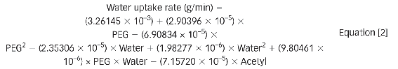 Design expert software (Design Expert V7; Stat-Ease, Inc., MN, USA) was used to analyse the water uptake data. Based on the data, a model was established to predict water uptake rate. The fitted model is: