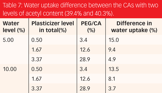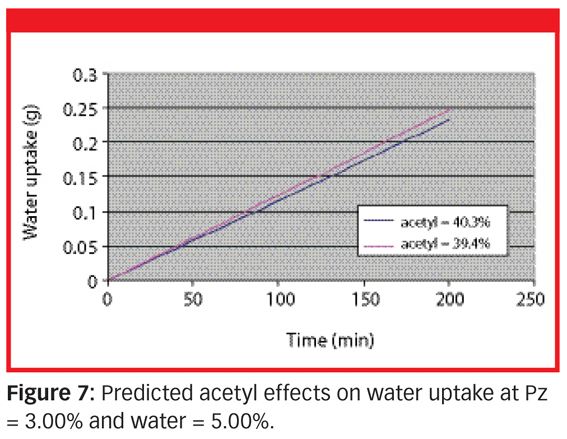 Figure 7 shows water uptake predicted from the model at Pz¡3.00%, Water¡5.00%, Acetyl¡40.3% and Acetyl¡39.4% and the difference in the water uptakes between the CAs with these two acetyl levels is 5.7%.