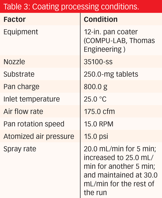 All of the coating runs, with a target coating weight at 10.0 wt% relative to the tablet weight, were performed in a pan coater (COMPU‑LAB; Thomas Engineering, Inc., IL, USA) with one spray gun under the processing conditions indicated in Table 3. For each run, 800.0 g of tablets were coated and all coating runs were repeated at least twice.