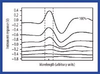 The frequency modulation spectroscopy measurement is conducted by frequency modulating a diode laser by superimposing a radio frequency oscillation, Ω, onto the diode injection current. The spectral output of a frequency modulated diode laser (see Figure 1) consists of a carrier frequency ωc and side band frequencies, ωc ± Ω. When the laser is scanned through the wavelength of moisture absorbance, the amount of light absorption, which is proportional to the concentration of the water molecules, is "written" into the side band frequencies by recording the difference in absorption between the two sidebands. The differential absorption information is recovered with phase-sensitive detection techniques. The demodulated absorption line shape is shown in Figure 2. The amount of light absorbed is directly proportional to the water concentration in the gas phase. The gaseous water density n is related to the peak-to-peak signal amplitude ΔI by Beer's law, which for a weakly absorbing molecule is given by: